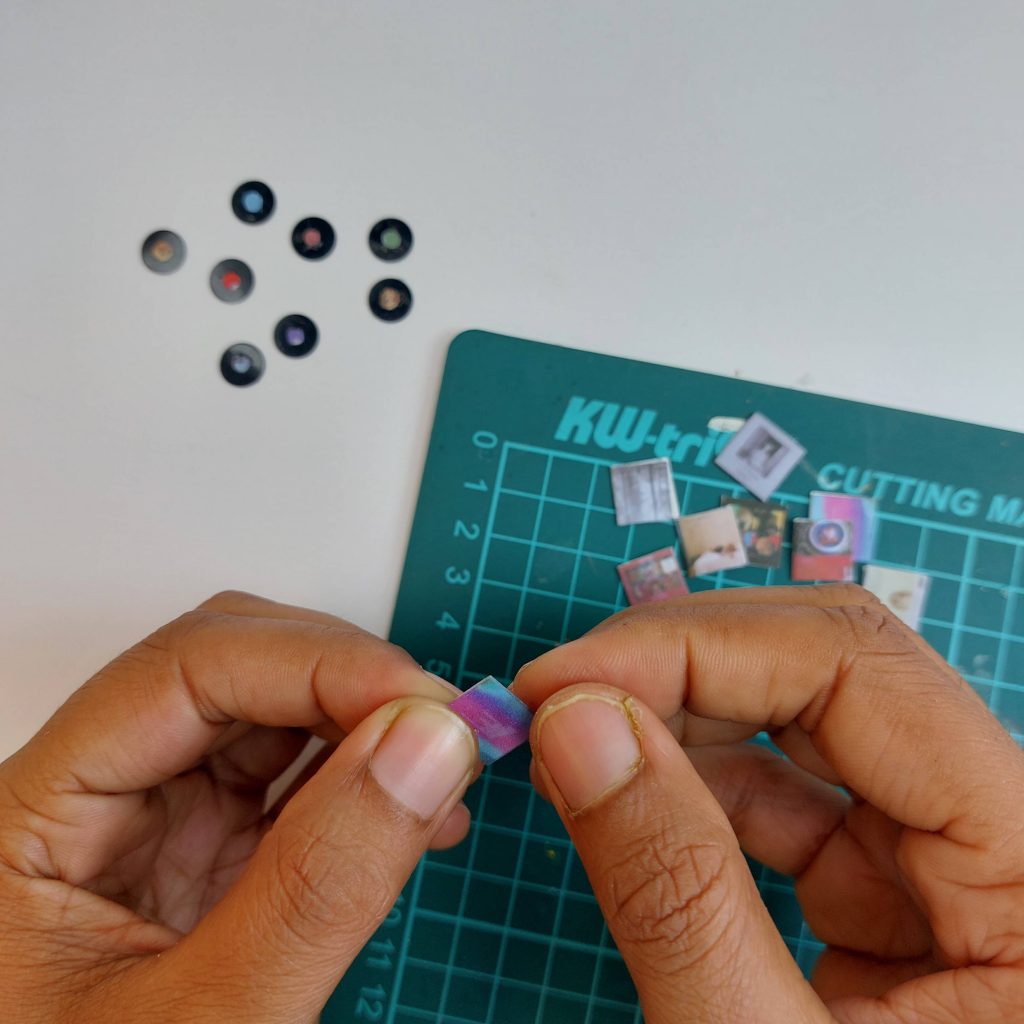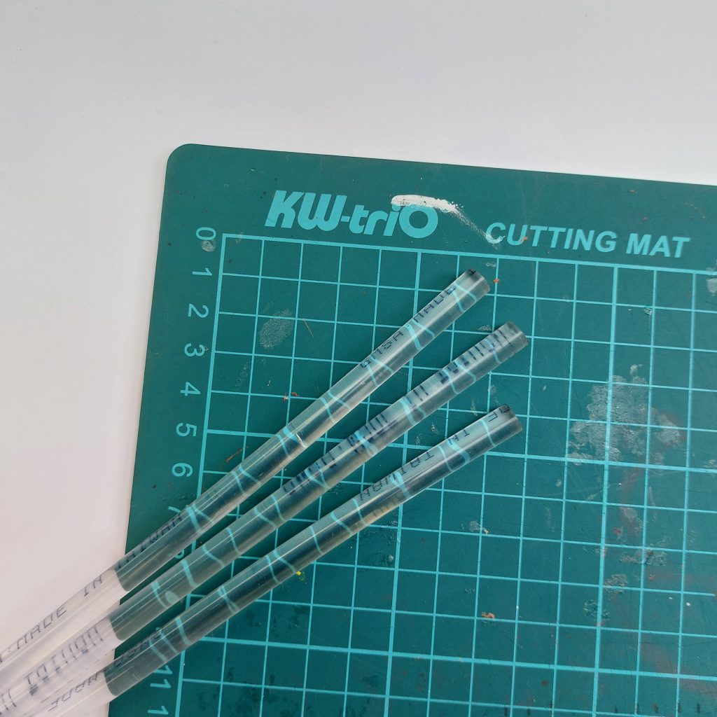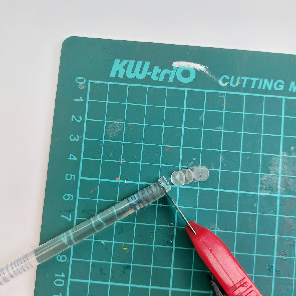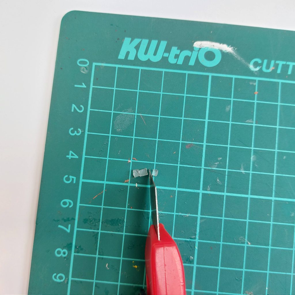 Start by taking a clear glue stick and placing it on a cutting mat. Using a sharp craft knife, carefully slice the glue stick into pieces. You don’t need to measure anything precisely: the goal is simply to create small segments that will later become cubes.