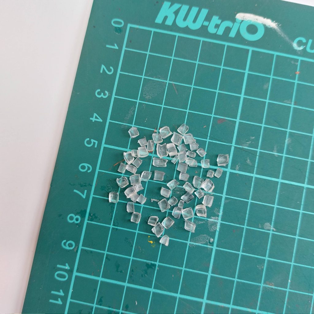 Once you have a few slices, cut those pieces again into smaller sections. At this stage they will look a bit irregular, but that actually helps. Real ice cubes are rarely perfect, and the slightly uneven shapes make them look more natural.