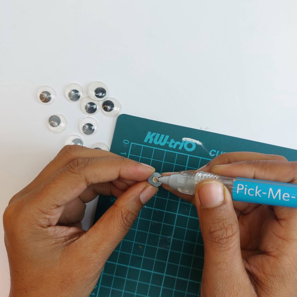 You can now glue the tiny vinyl labels on these googly eyes.