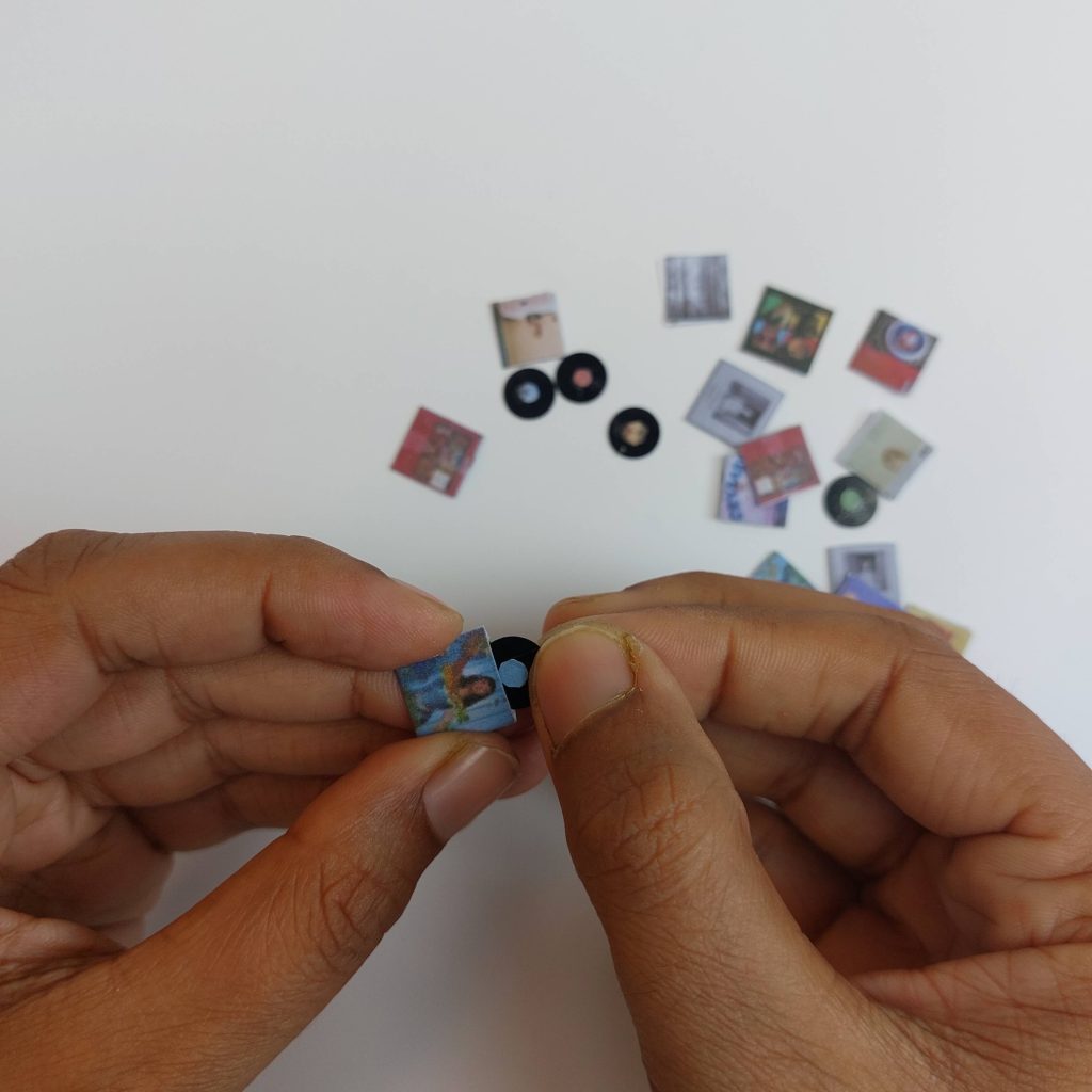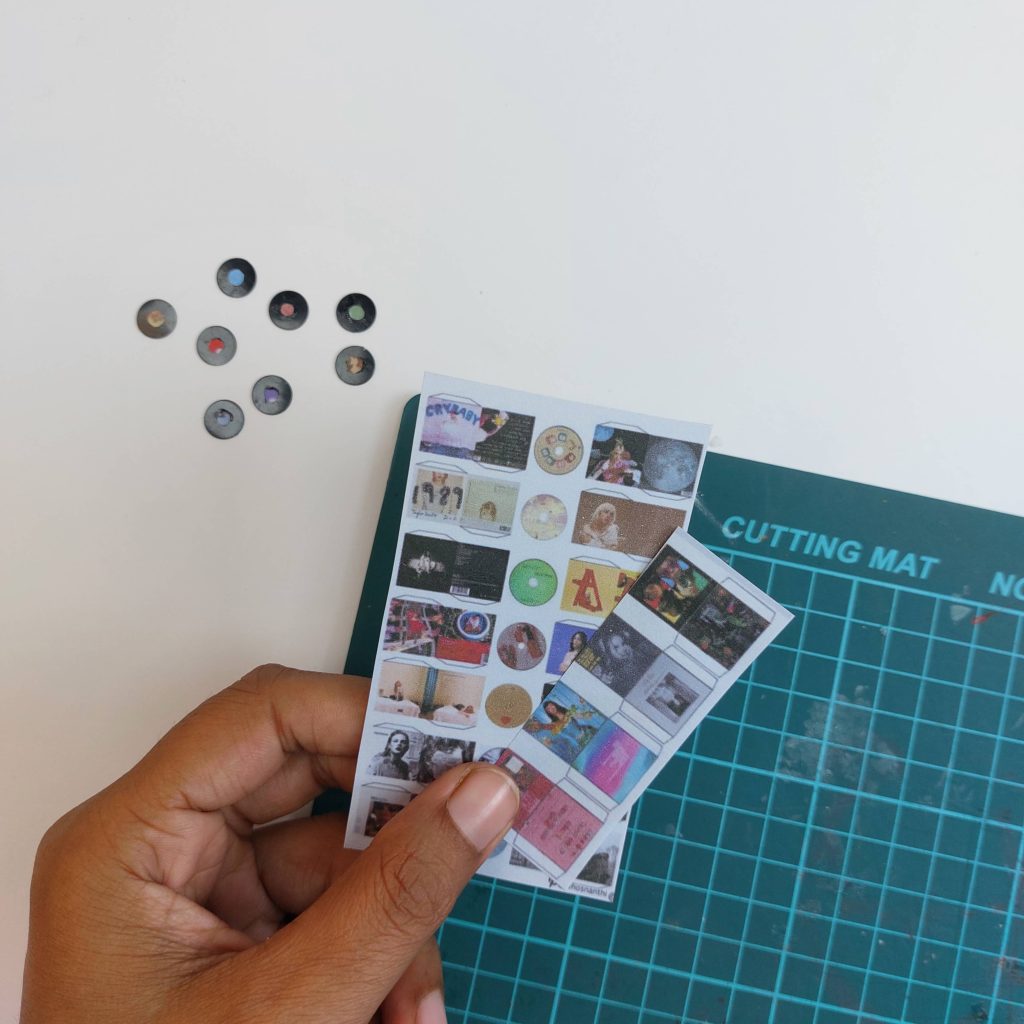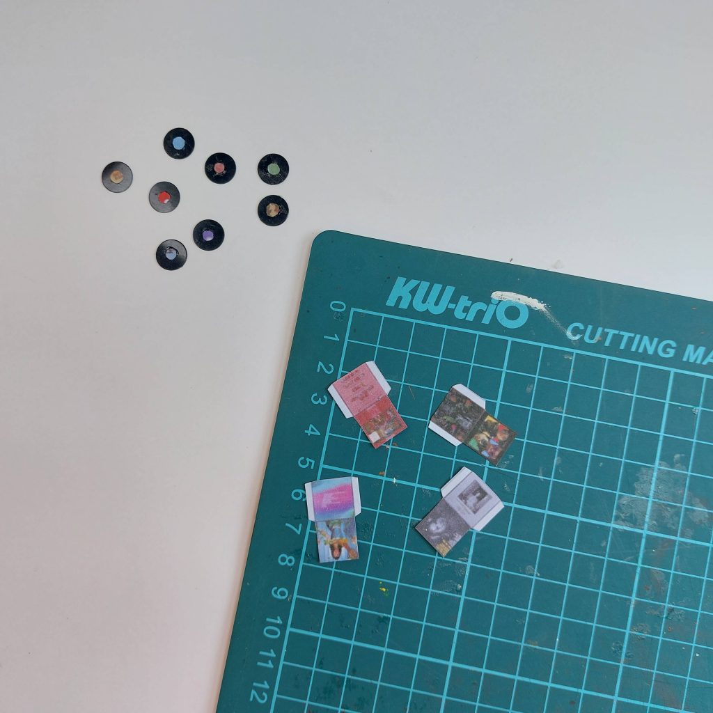 I used a small hole punch to cut the tiny circles that became the labels in the center of the miniature vinyl records.