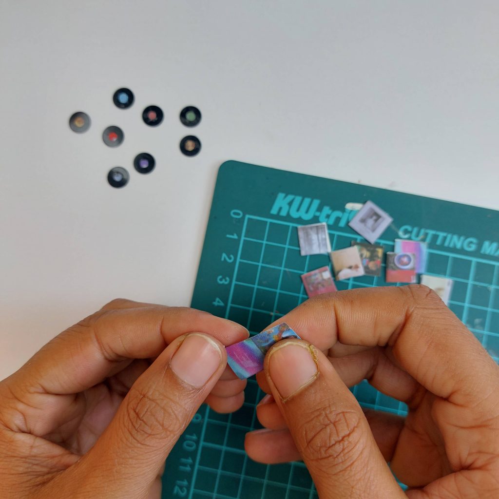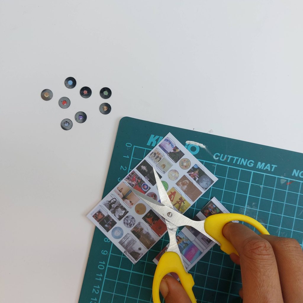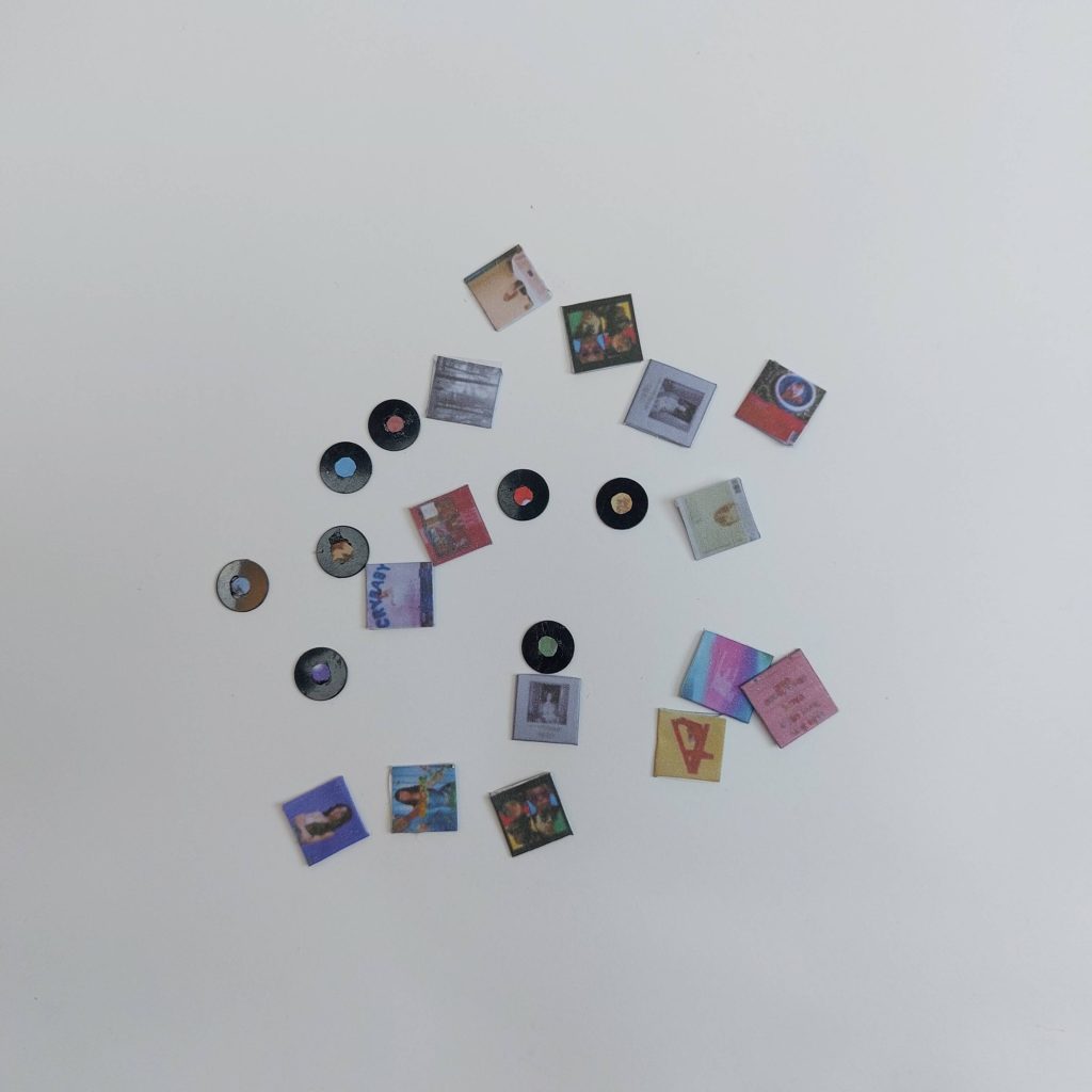 I used a small hole punch to cut the tiny circles that became the labels in the center of the miniature vinyl records.