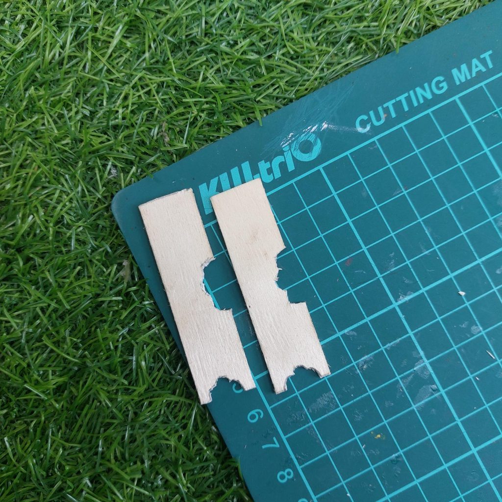 Start with two wooden pieces cut to about 6.5 cm high and 2.5 cm deep. Draw a soft, curved cut-out on one side.