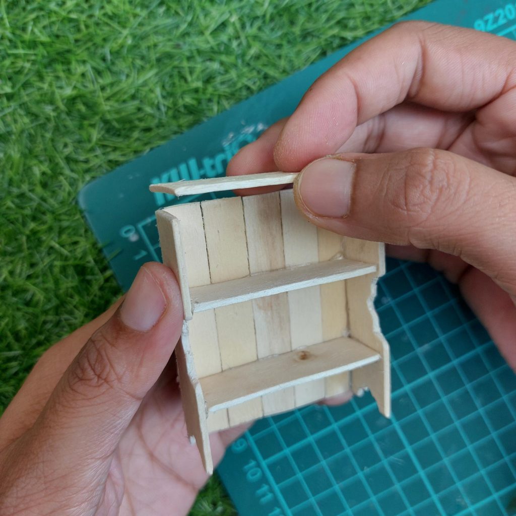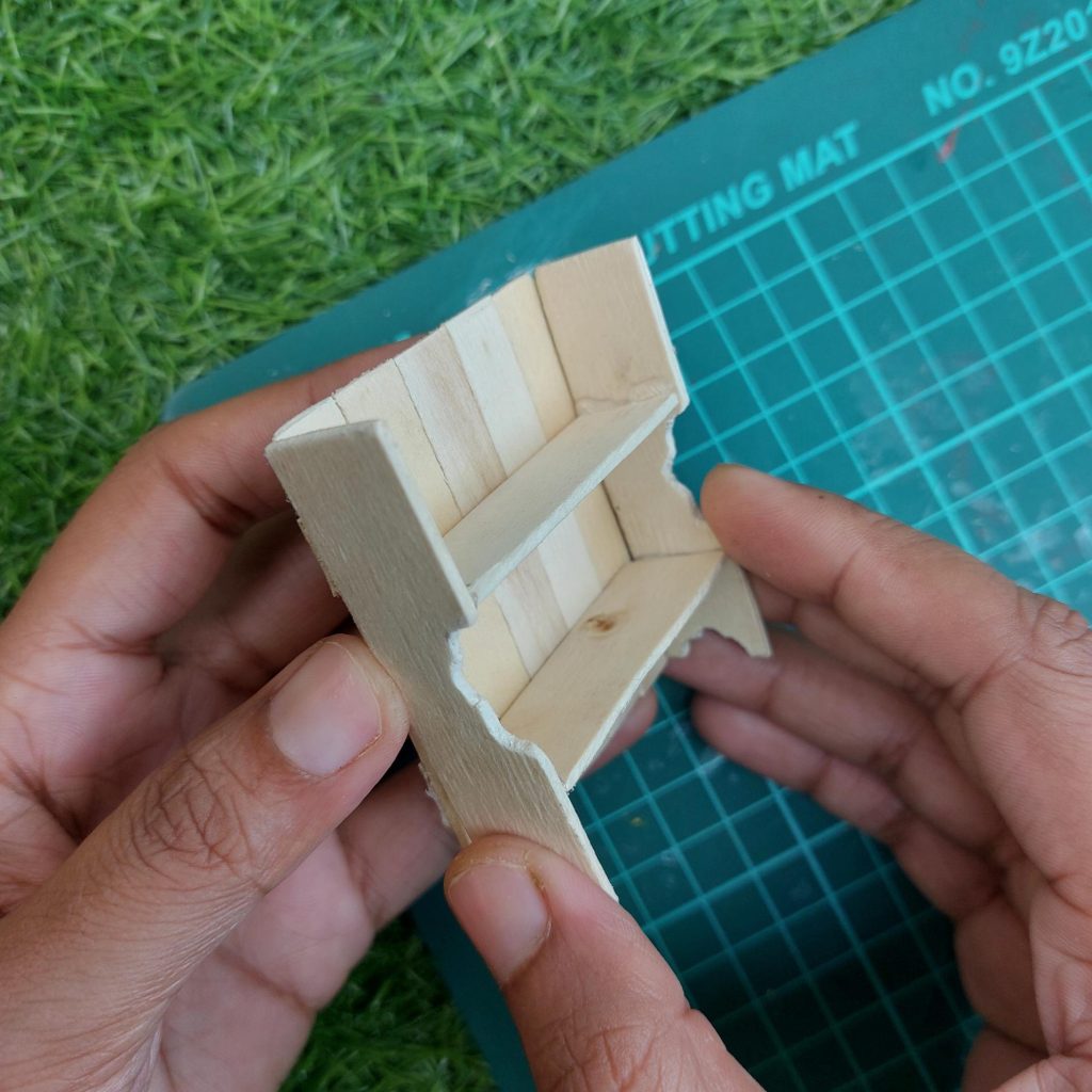 Glue the bottom shelf first, leaving about 2.5 to 3 cm space from the base. Then add the second shelf about 2 to 2.5 cm above it.