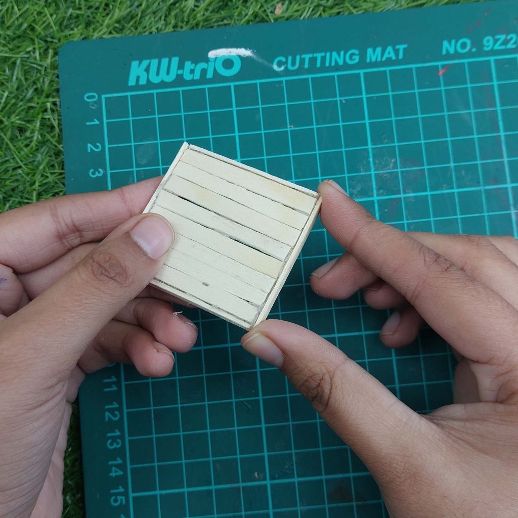 Once dry, glue the side frame pieces (0.5 × 4.7 cm) along the left and right edges of the tabletop to give it a framed look and extra strength.