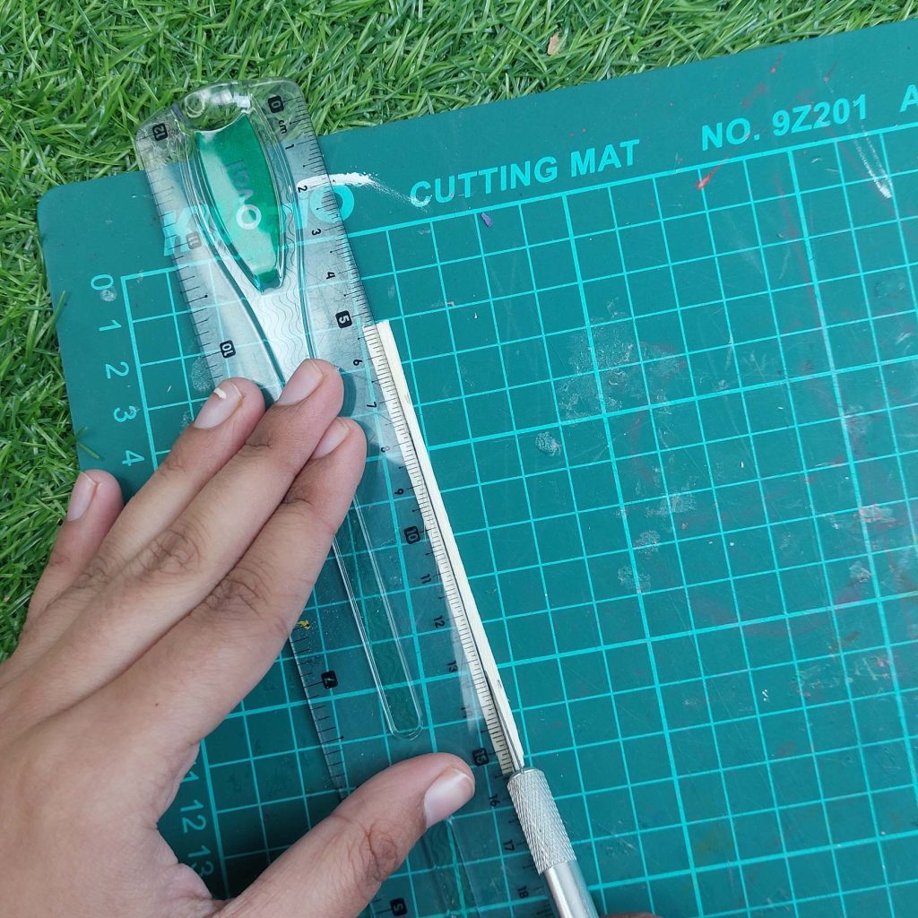 Place the craft stick on your cutting mat, hold a ruler firmly on top of it, and with your craft knife or box cutter, score along the length of the stick (don’t try to cut through in one pass).