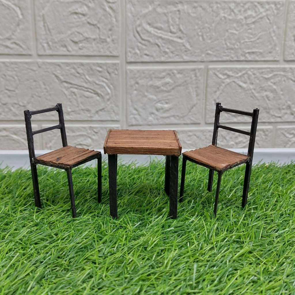 You’ll end up with a simple, rustic miniature table and two matching chairs that work in almost any setting—kitchen, café, terrace, or garden scene.
