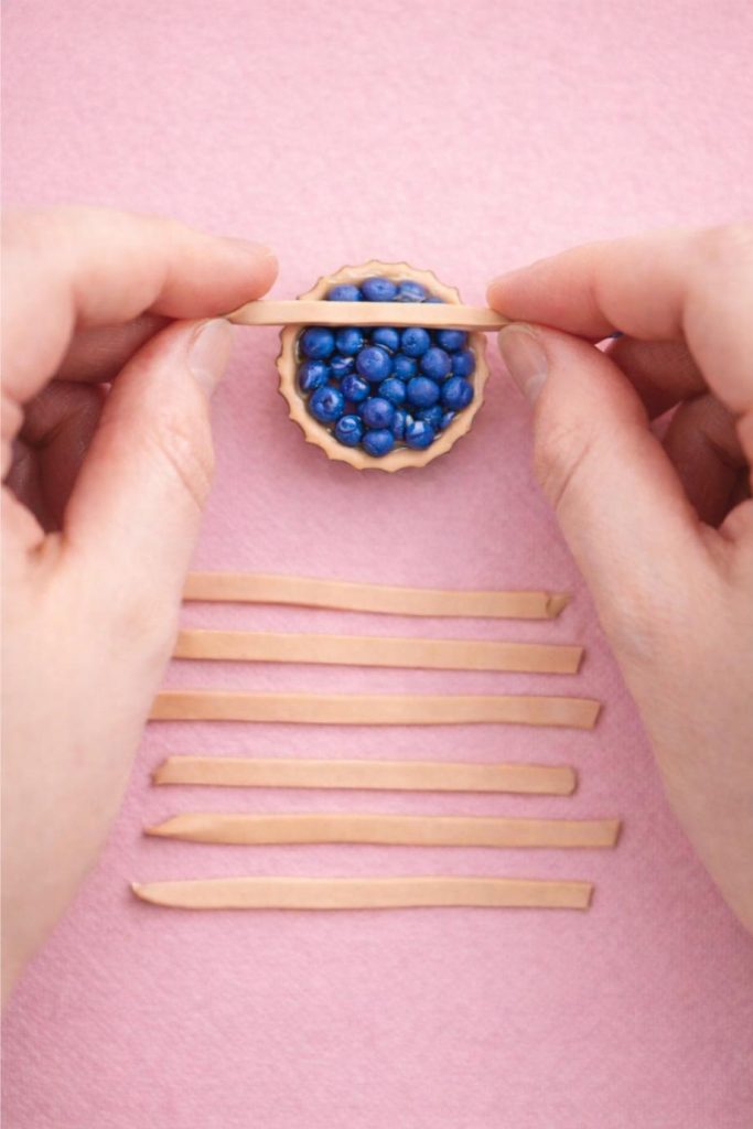 Roll out more clay and cut thin strips in a color that looks like deliciously baked crust.