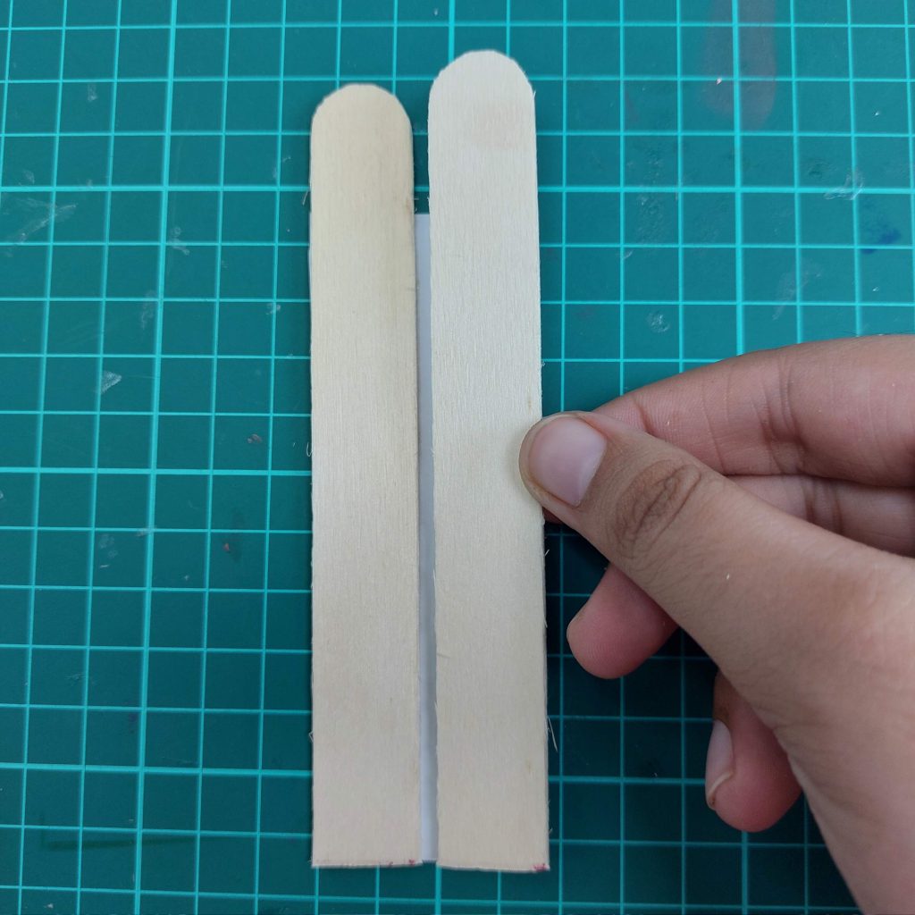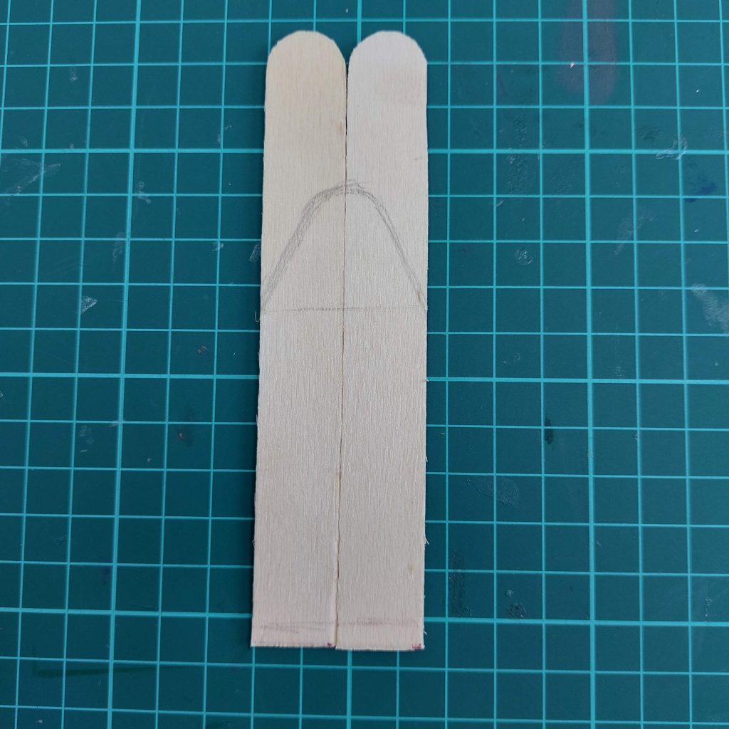 Glue two popsicle sticks side by side. Sketch out the rounded end of the ironing board on them and cut along the line. This forms the base shape.