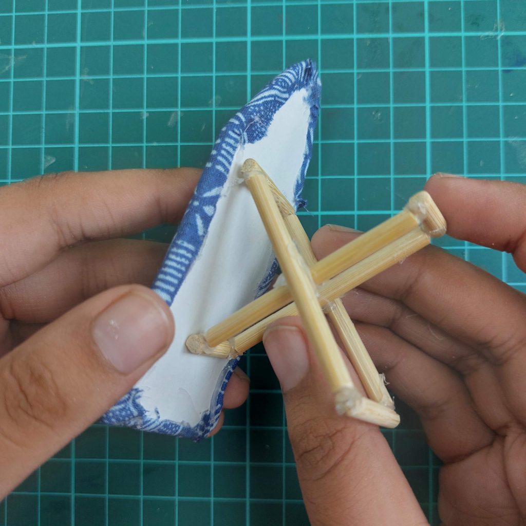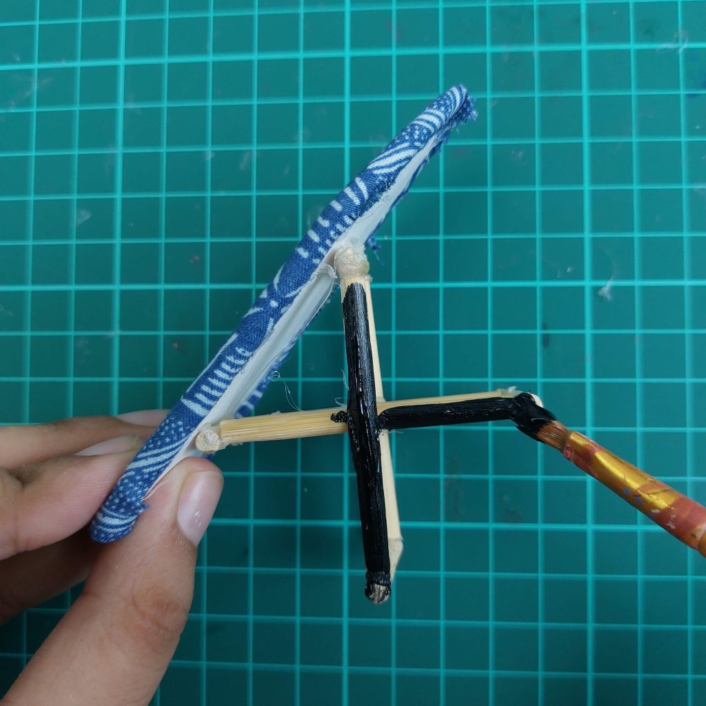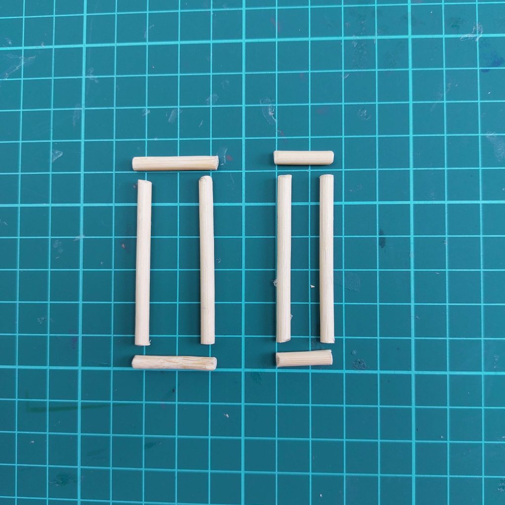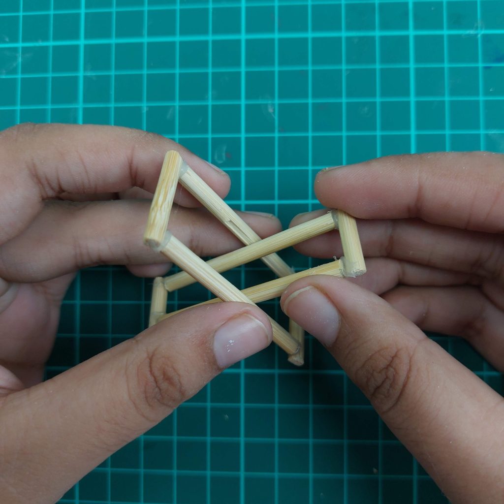 Cut barbecue sticks to the given dimensions and form two X-shaped stands. Glue the pieces together firmly.