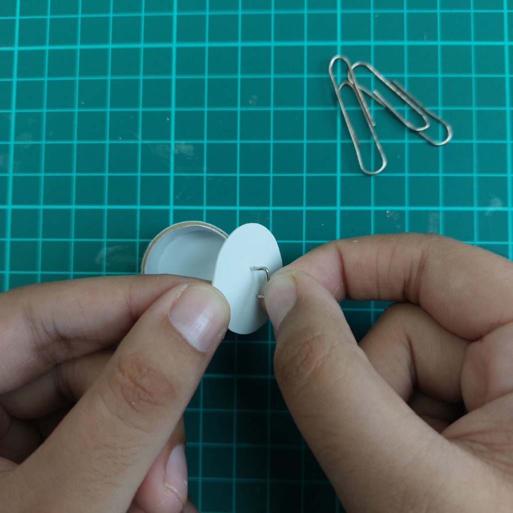 Bend a small piece of paper clip into a U-shape and poke it through the lid. Glue the ends in place from the underside.