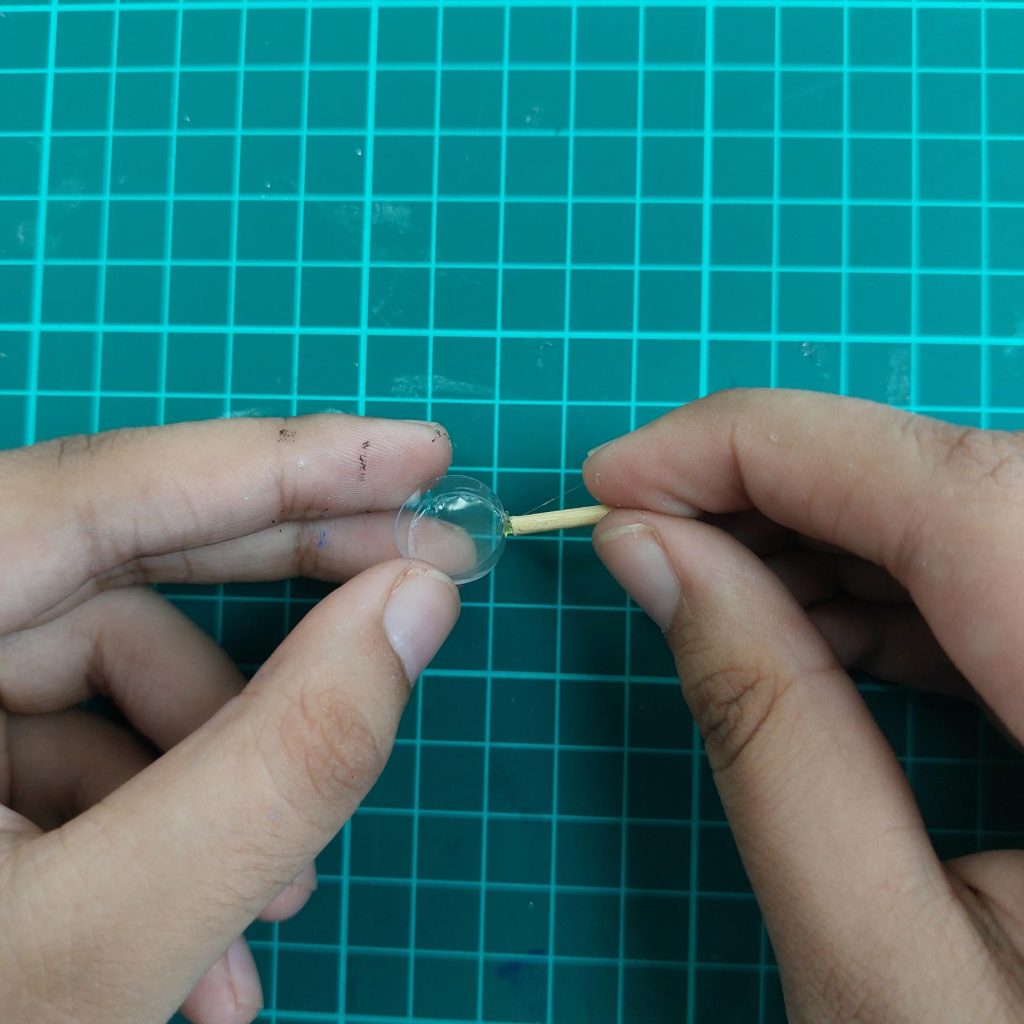 Glue a toothpick or a small wooden stick to the side of the blister. This will serve as the pan handle.