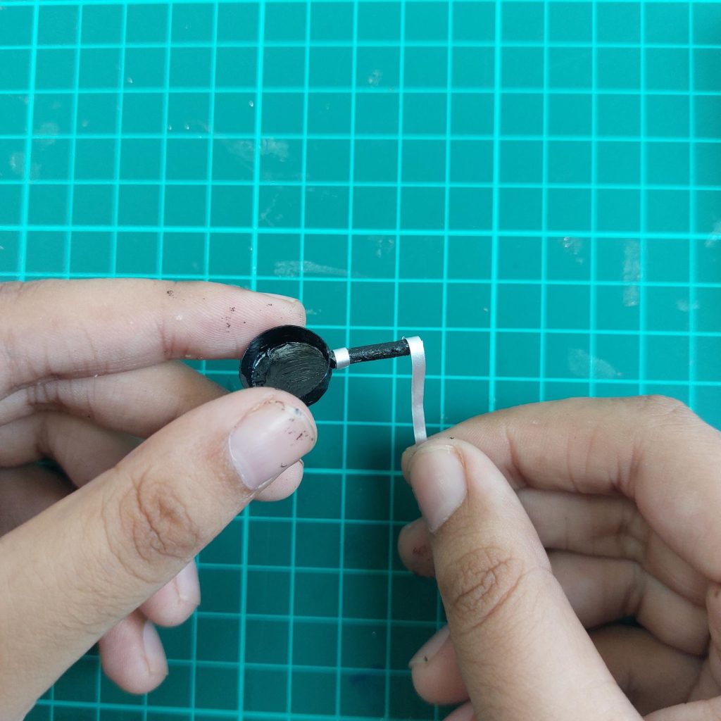 Cut two tiny pieces of paper clip, bend them, and glue them to the sides of the pot.