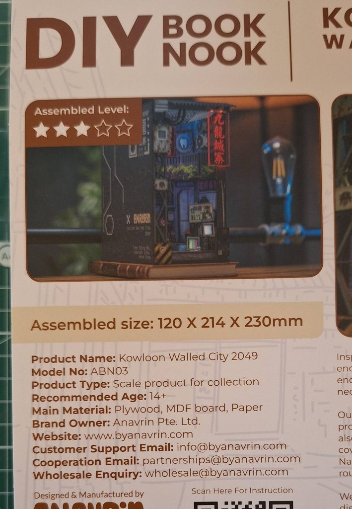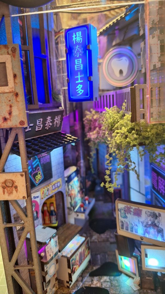 Instead of recreating it as it once was, this kit imagines what it might look like decades into the future: dense, vertical, neon-lit, and full of atmosphere. It’s very different from the more traditional or historical book nooks, and that’s exactly what made me curious to assemble it.
