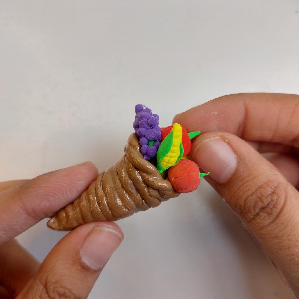 A cornucopia is such a classic fall symbol, and this tiny version is perfect for dollhouse Thanksgiving scenes, harvest displays, or cozy autumn décor. It’s surprisingly simple once you get the hang of shaping the horn, so you can fill it with mini fruit and veggies.
